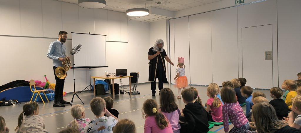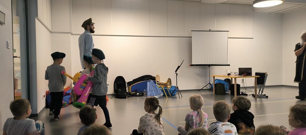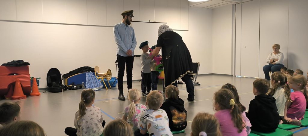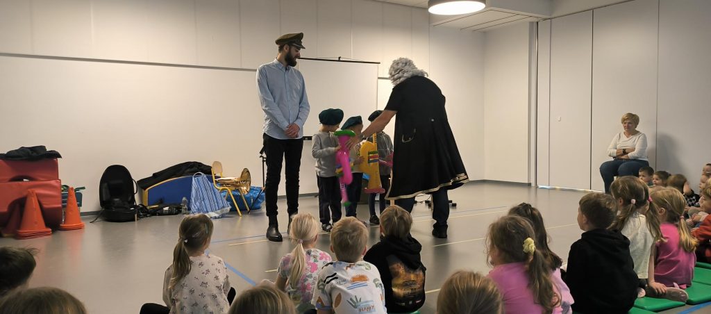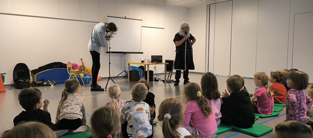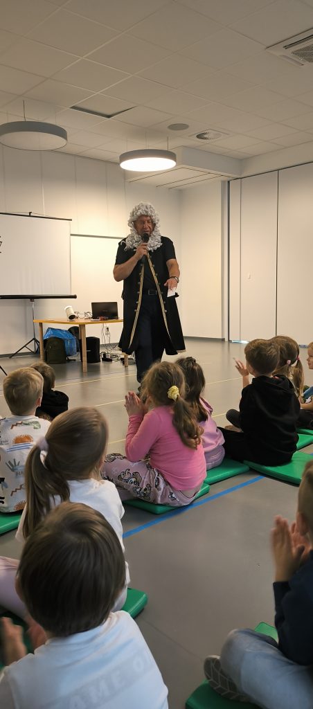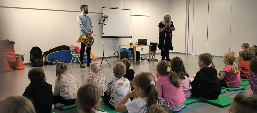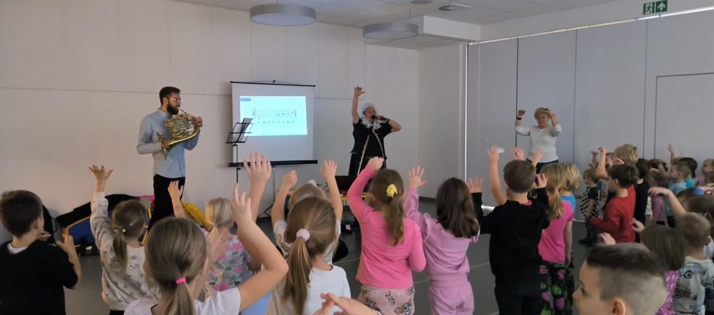 Dziś, 05.11.2025 roku wraz z zaproszonym gościem i instrumentem zwanym waltornią zagościł u nas Dziadek Bach. Waltornia, znana również jako róg francuski lub róg, to instrument dęty blaszany o charakterystycznym, szlachetnym brzmieniu. Jest to instrument wymagający dużej precyzji i wprawy, często stosowany w orkiestrach symfonicznych, ale zyskujący popularność również w jazzu. Dziadek Bach zaprosił wszystkie przedszkolaki na koncert, który dał możliwość posłuchania muzyki na żywo, wsłuchania się w grę orkiestry. Z okazji zbliżającego się Święta Odzyskania Niepodległości przez Polskę odśpiewaliśmy nasz hymn narodowy. Spotkanie z Dziadkiem Bachem było jak zwykle bardzo miłe i obfite w wiedzę.